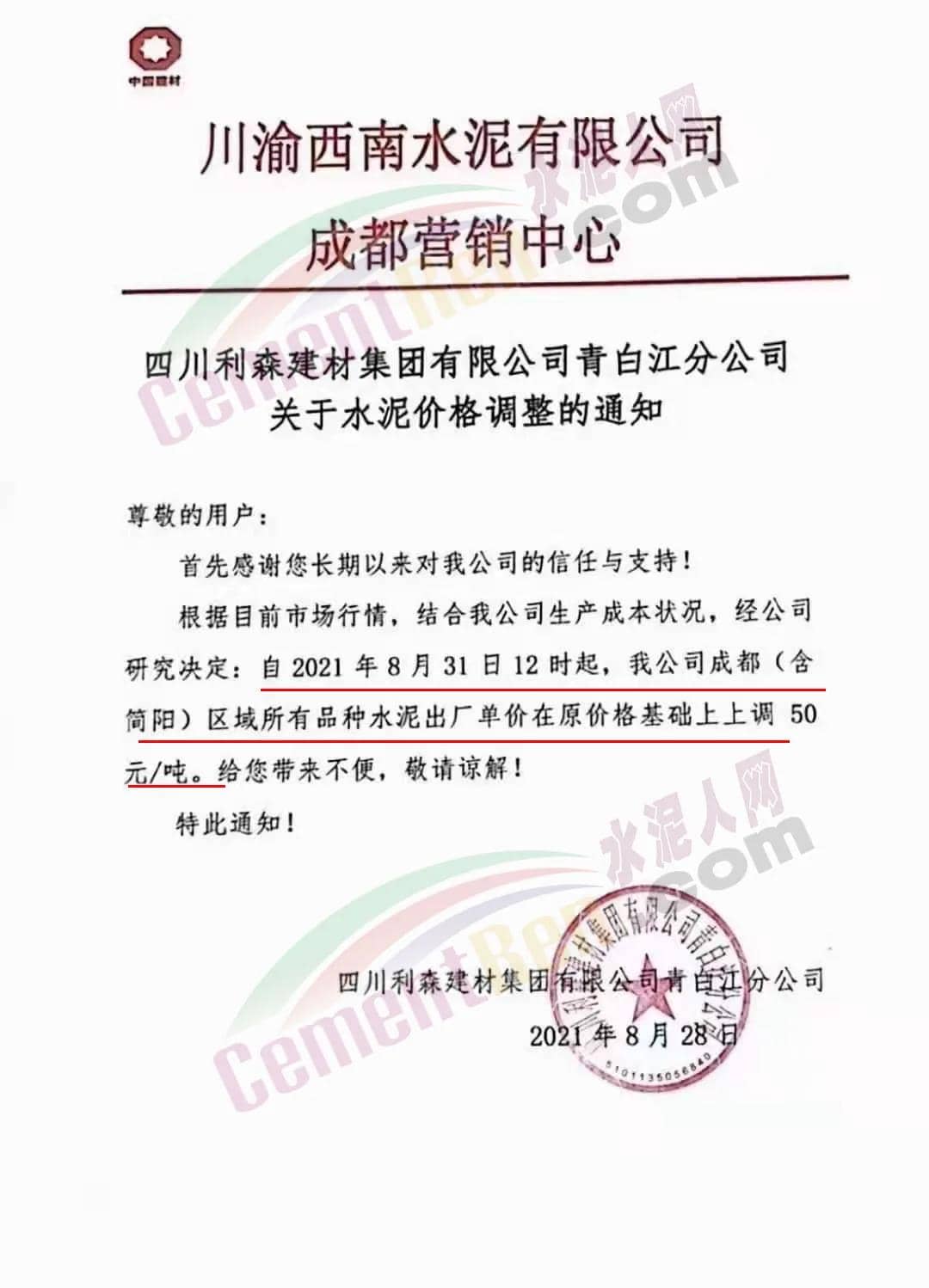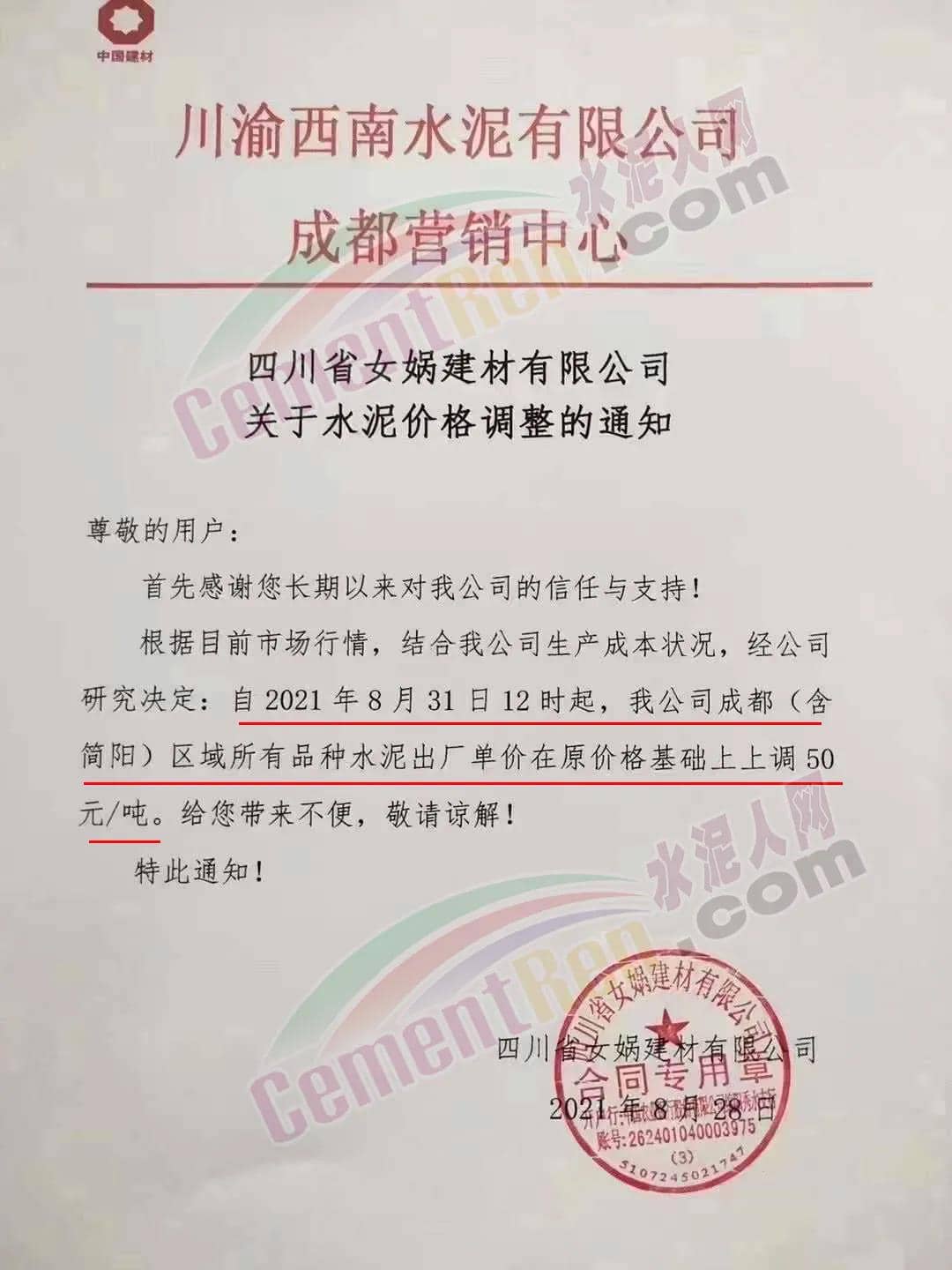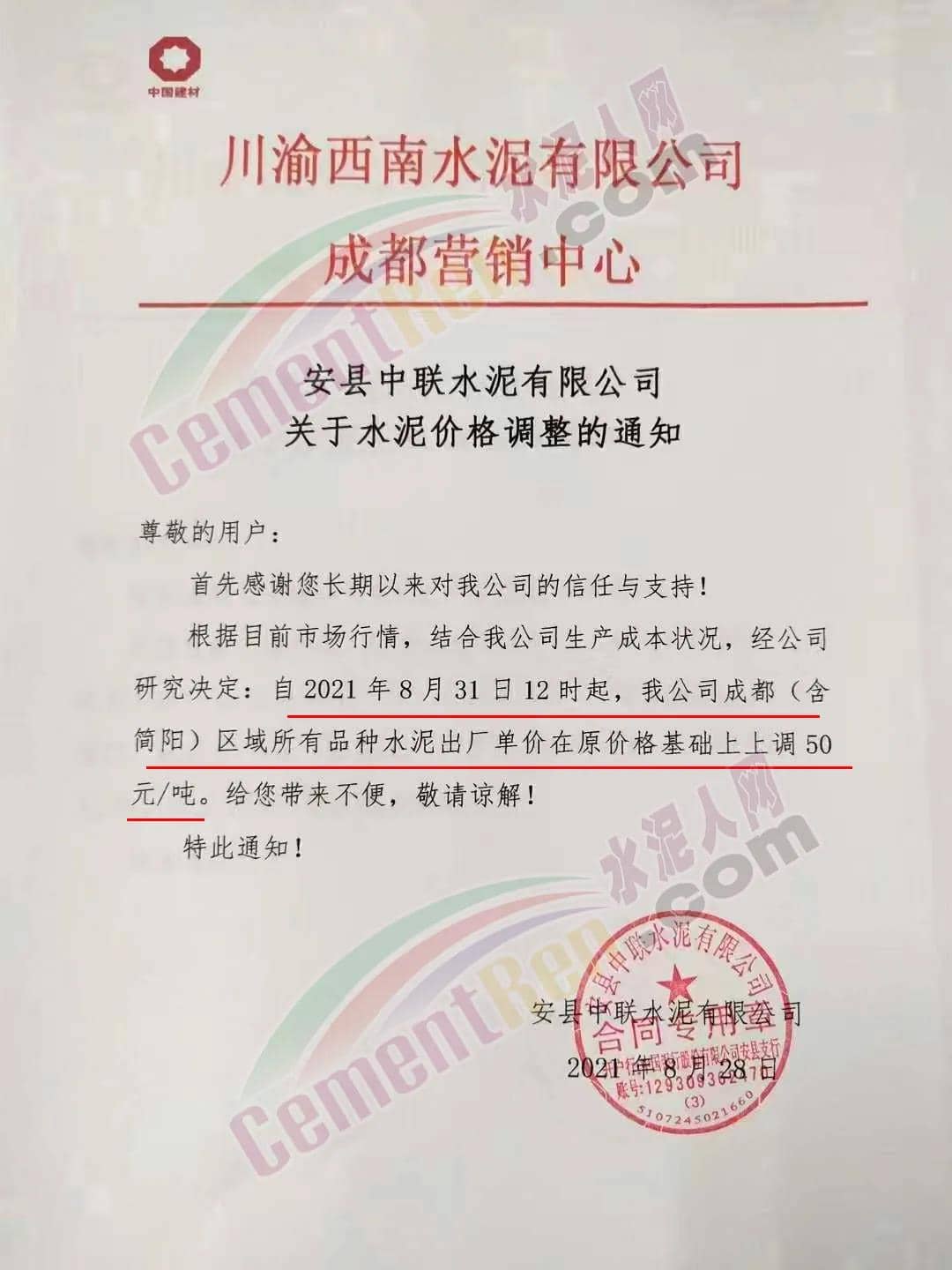 安县中联水泥、崇州西南水泥、四川德胜集团、峨眉山西南水泥、四川利森集团、绵竹澳东水泥、女娲建材等通知称,根据目前市场行情 ,结合公司生产成本状态,经公司研究决定自8月31日12时起,成都(含简阳)区域所有品牌水泥出厂单价在原价基础上上调50元/吨。