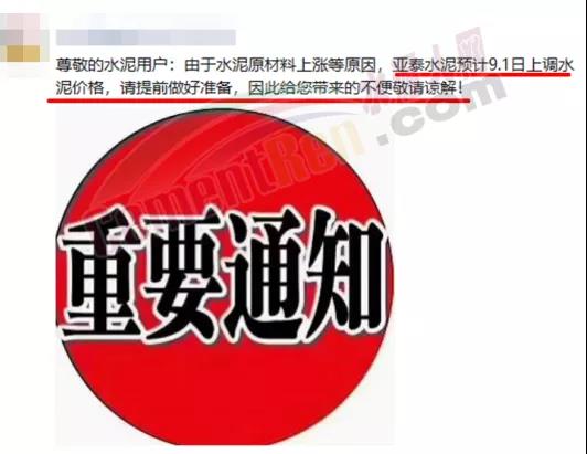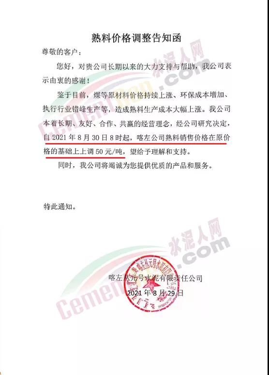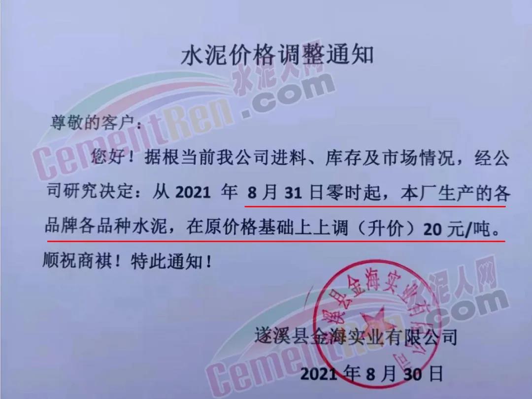 同日,广东省湛江市遂溪县金海实业有限公司通知,据根当前公司进料、库存及市场情况,经研究决定从2021年8月31日零时起,本厂生产的各品牌各品种水泥,在原价格基础上上调20元/吨。