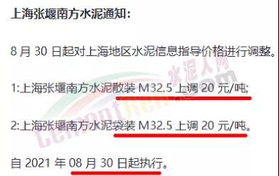 8月30日上海地区主流品牌P.C42.5、M32.5水泥价格上涨20元/吨,通知称因原料供应紧张,成本持续增加,加之下游需求好转,因此水泥价格再次推涨。