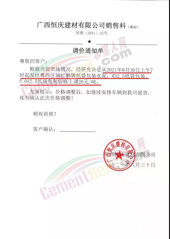 广西恒庆建材有限公司销售科通知根据当前市场情况,经研究决定从2021年8月30日上午7时起发往粤西区域红狮牌纸袋包装水泥,M32.5纸袋包装、P.042.5纸袋包装价格上调20元/吨。