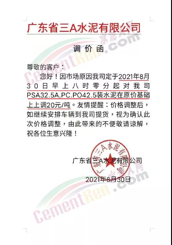 同期,广东省三A水泥有限公司通知,因市场原因公司定于2021年8月30日早上八时零分起对公司PSA32.5A,PC42.5、PO42.5装装水泥在原价基础上上调20元/吨。