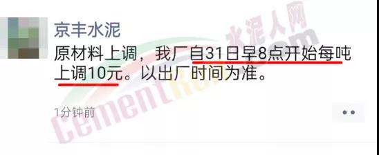 唐山京丰水泥通知,自8月31日起上调水泥价格10元/吨。