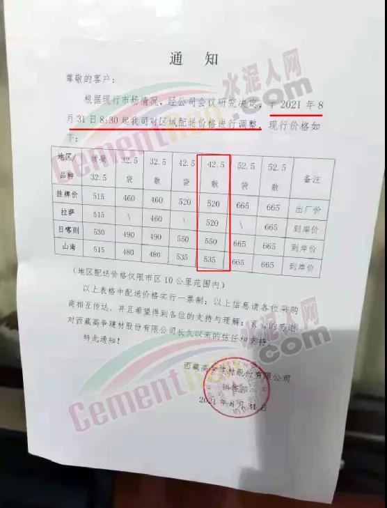 西藏高争建材股份有限公司通知8月31日8时起公司对区域配送价格进行调整。调整后P.O42.5散装水泥出厂挂牌价520元/吨,到位价拉萨市场执行520元/吨,日喀则市场执行550元/吨,山南市场执行535元/吨,地区配送价格仅限市区10公里范围内。