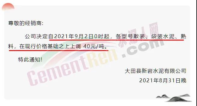 大田县新岩水泥有限公司通知称,公司决定自2021年9月2日0时起,各型号散装、袋装水泥、熟料,在现行价格基础之上上调 40元/吨。