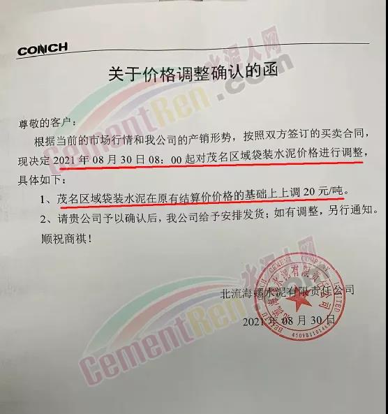 北流海螺水泥通知,根据当前的市场行情和公司的产销形势,按照双方签订的买卖合同,决定自2021年8月30日8时起对茂名区域袋装水泥结算价上调20元/吨。