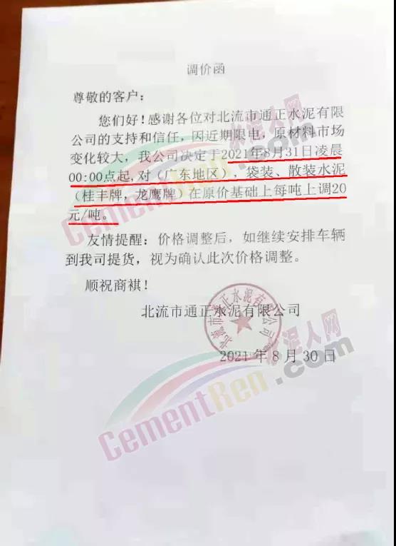 北流市通正水泥有限公司通知称,因近期限电,原材料市场变化较大,公司决定于2021年8月31日凌晨0时起,对(广东地区),袋装、散装水泥(桂丰牌,龙鹰牌)在原价基础上上调20元/吨。