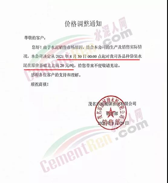 茂名市油城牌水泥有限公司通知,由于水泥销售市场原因,结合公司的生产及销售实际情况,本公司决定从2021年8月30日零时起对各品种袋装水泥在原价基础上上调20元/吨。
