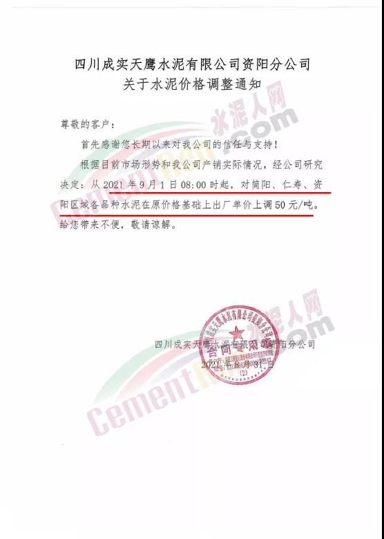 四川成实天鹰水泥有限公司资阳分公司通知根据目前市场形势和公司产销实际情况,经公司研究决定从2021年9月1日8时起,对简阳、仁寿、资阳区域各品种水泥在原价格基础上出厂单价上调50元/吨。