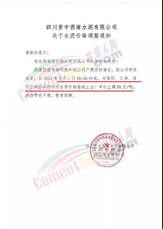 四川资中西南水泥有限公司通知根据目前市场形势和公司产销实际情况,经公司研究决定,从9月1日8时起,对简阳、仁寿、资阳区域各品种水泥在原价格基础上出厂单价上调50元/吨。
