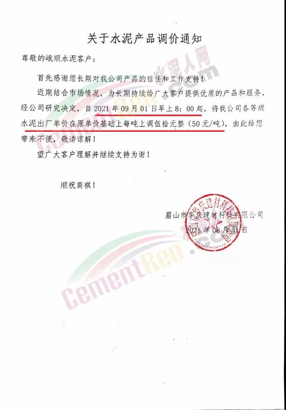眉山市华庆建材科技有限公司通知结合市场情况,为长期持续给广大客户提供优质的产品和服务,经公司研究决定,自2021年9月1日8时起,将公司各等级水泥出厂单价在原单价基础上上调50元/吨。