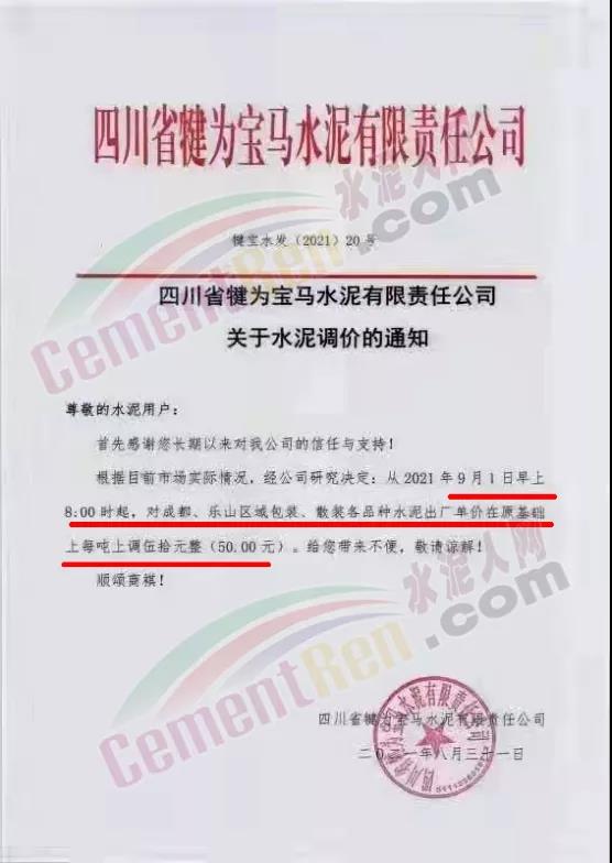 四川省犍为宝马水泥有限责任公司通知,自9月1日早8时起,对成都、乐山区域包装、散装水泥出厂单价在原基础上上调50元/吨。