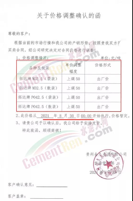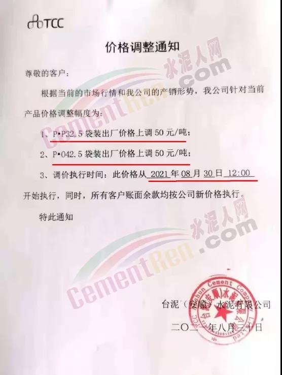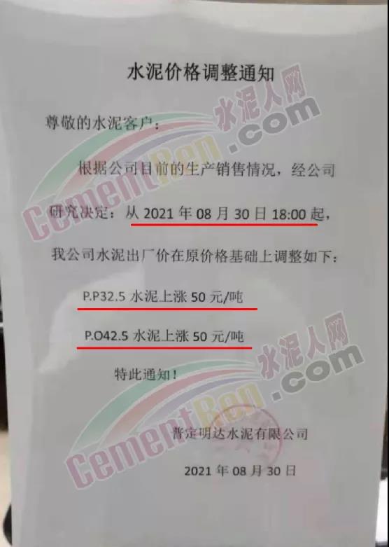 贵州省安顺市普定县普定明达水泥有限公司通知根据公司目前的生产销售情况,经公司研究决定从2021年8月30日18时起,公司水泥出厂价在原价格基础上P.P32.5水泥上涨50元/吨,P.O42.5水泥上涨50元/吨。