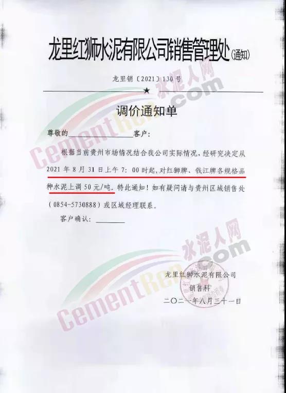 龙里红狮水有限公司通知,根据当前贵州市场情况结合公司实际情况,经研究决定从2021年8月31日上午7时起,对红狮牌、钱江牌各规格品种水泥上调50元/吨。