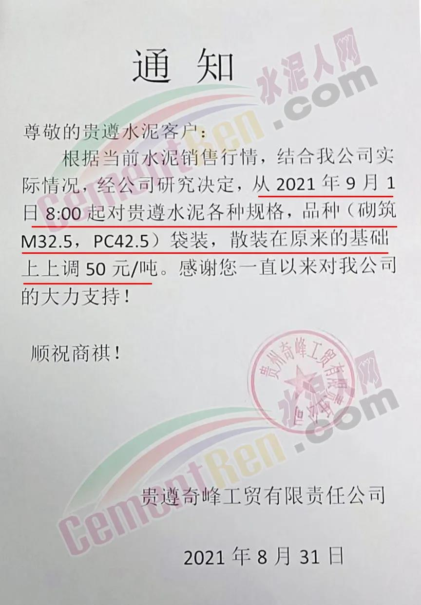 贵遵奇峰工贸有限责任公司通知,根据当前水泥销售行情,结合公司实际情 况,经公司研究决定,从2021年9月1日8时起对贵遵水泥各规格品种(砌筑M32.5、PC42.5)袋装、散装在原来的基础上上调50元/吨。