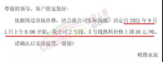 同日,安徽皖维水泥通知,自2021年9月1日上午8:00开始,公司2号线、3号线熟料价格上调30元/吨。