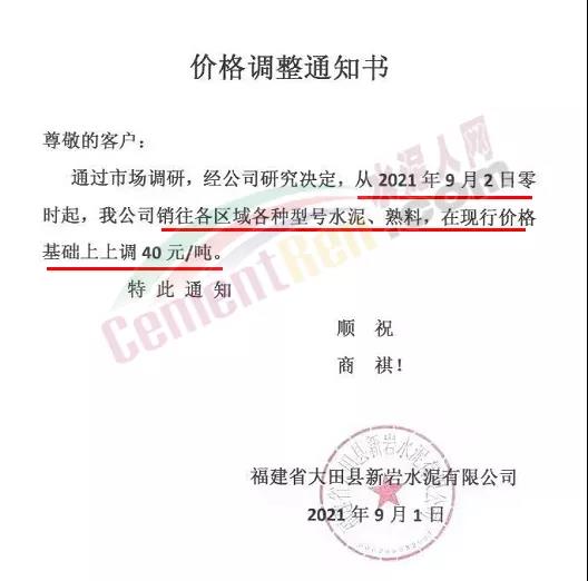 福建省大县田新岩水泥有限公司通知通过市场调研,经公司研究决定,从9月2日零时起公司销往各区域各型号水泥、熟料在现行价格基础上上调40元/吨。