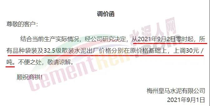 梅州皇马水泥有限公司通知,从2021年9月2日零时起,所有品种袋装及32.5级散装水泥出厂价格分别在原价格基础上上调30元/吨。