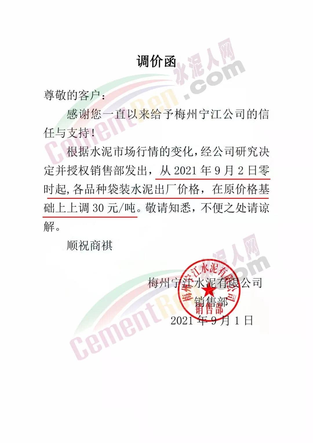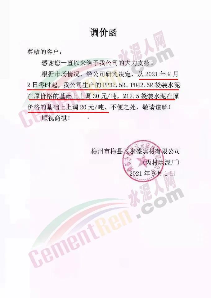 梅州宁江水泥有限公司通知,根据水泥市场行情的变化,经公司研究决定并授权销售部发出,从 2021年9月2日零时起,各品种袋装水泥出厂价格,在原价格基础上上调30 元/吨。