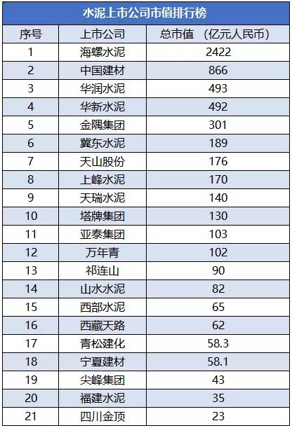 从上述榜单来看,截至9月6日晚间收盘时,总市值超过1000亿的水泥企业只有一家——海螺水泥。而排名前五的水泥企业分别是:海螺水泥2422亿、中国建材866亿、华润水泥493亿、华新水泥492亿、金隅集团401亿。