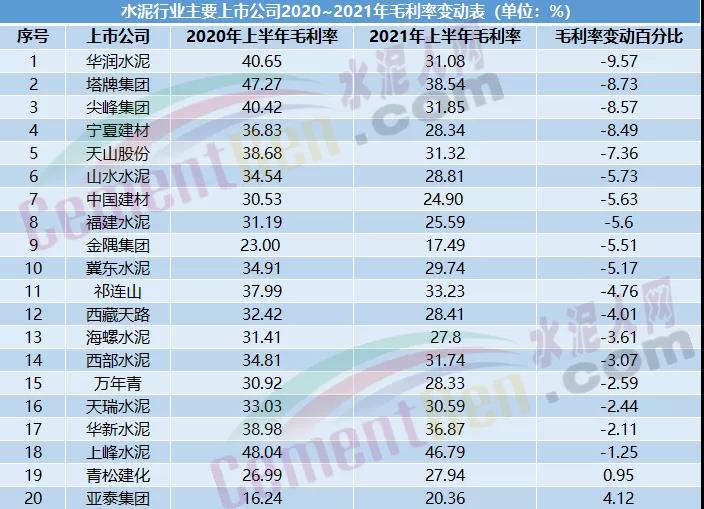 毛利率是企业在直接生产过程中的获利能力的财务反映,代表了企业核心竞争力。据水泥人网不完全统计,截止至9月9日,水泥行业20家发布半年报的上市公司中,有17家出现了毛利率下滑的现象,占比约为86%,其中,华润水泥毛利率下滑幅度最大,约为9.57%。