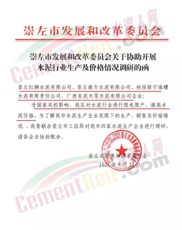 近日,崇左市发改委发调研函给辖区内红狮、南方、海螺、东泥天等等水泥企业称,受国家双控影响,广西壮族自治区对水泥行业进行限电限产,推高水泥价格,为了解崇左市水泥企业双限下的生产、销售及价格情况,崇左市发改委联合崇左市工信局将对区域内四家水泥生产企业进行调研。
