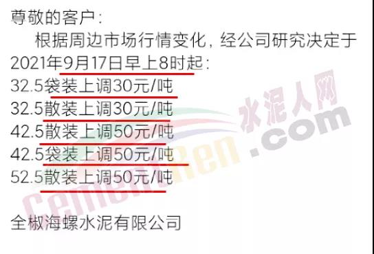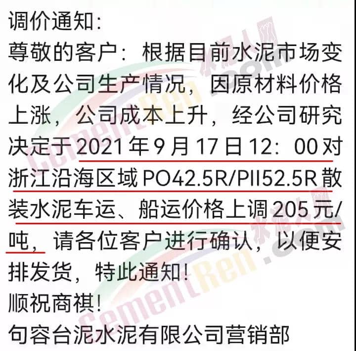 句容台泥水泥有限公司通知称,根据目前水泥市场变化及公司生产情况,因原材料价格上涨,公司成本上升,经公司研究决定于2021年9月17日12时对浙江沿海区域PO42.5R/PII52.5R散装水泥车运、船运价格上调205元/吨,创造了近年来单次涨价最高纪录。