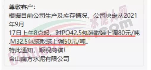 同日,含山南方水泥有限公司通知根据目前公司生产及库存情况,公司决定从2021年9月17日上午8点起,对PO42.5包装散装上调80元/吨。M32.5包装散装上调50元/吨。