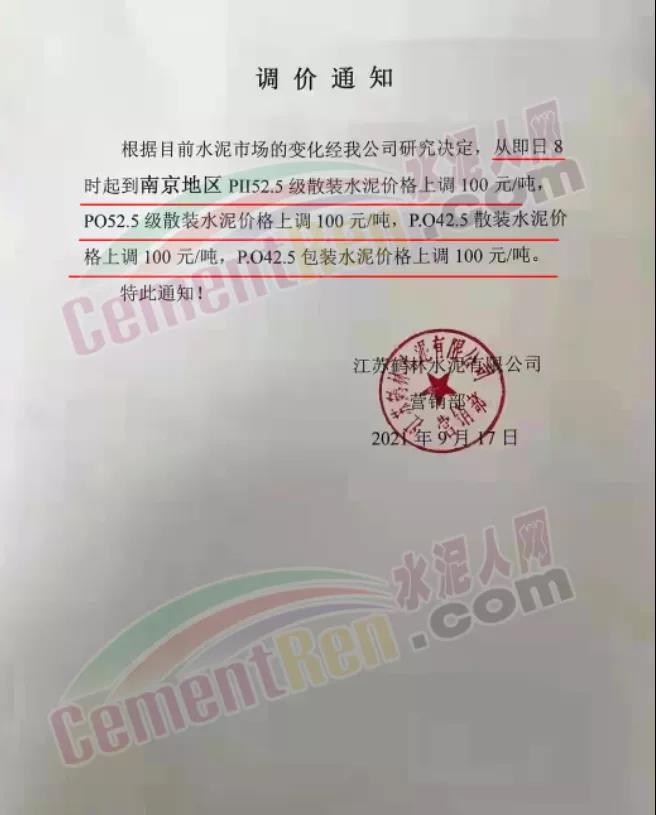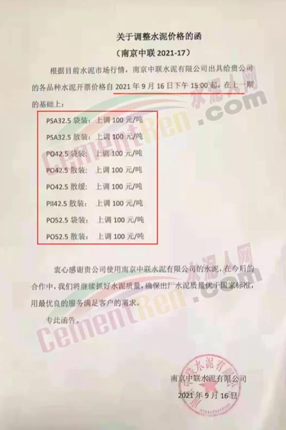 南京中联水泥有限公司通知,根据目前水泥市场行情,自9月16日下午15时起各标号水泥上调100元/吨。