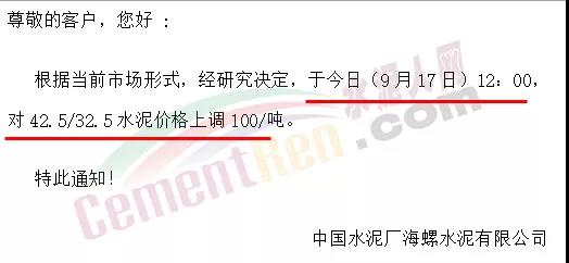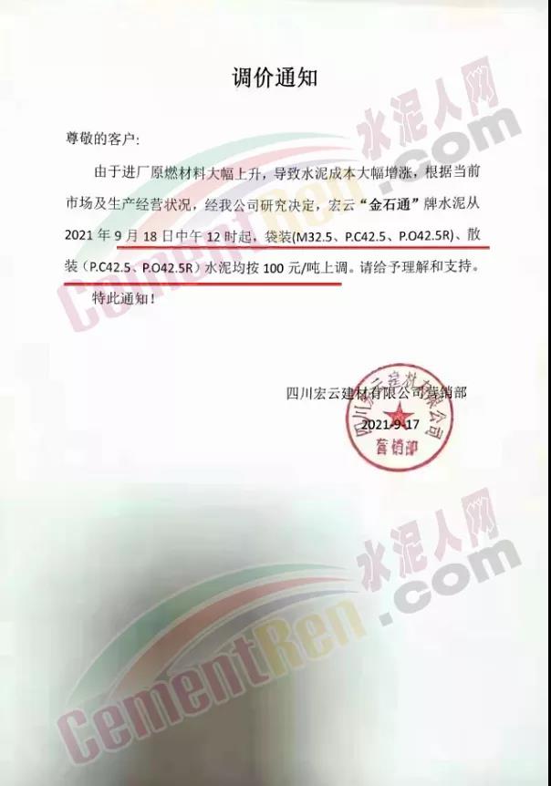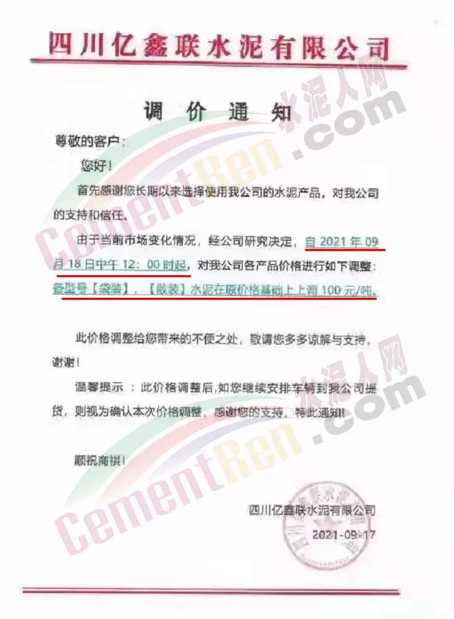 四川亿鑫联水泥通知,9月18日中午12时起,各标号水泥上调100元/吨。