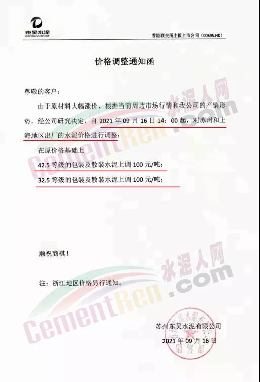 东吴水泥通知,由于原材料大幅涨价,根据当前周边市场行情及公司的产销形势,自9月16日14时起,对苏州和上海地区的出厂水泥价格上调100元/吨。