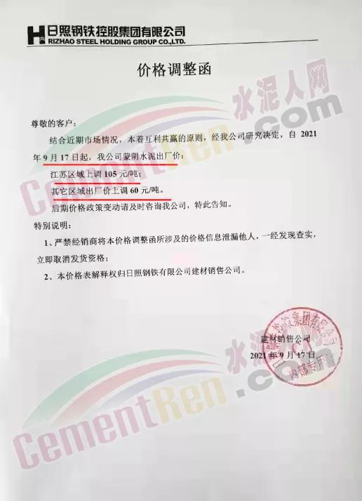 日照钢铁控股集团通知,自9月17日起公司蒙阴水泥出厂价,江苏区域上调105元/吨,其他区域出厂价上调60元/吨。