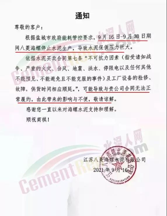 据水泥人网此前消息,9月16日八菱海螺发通知称,根据江苏省盐城市政府能耗管控要求,9月16日-9月30日期间八菱海螺停止水泥生产,导致水泥保供压力巨大。不可抗力因素可能导致与贵公司合同无法正常履约。