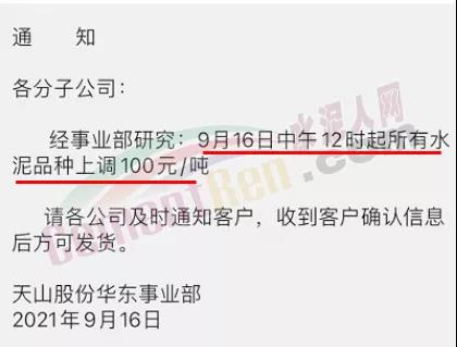 天山股份华东事业部通知,9月16日中午12时起所有水泥品种上调100元/吨。