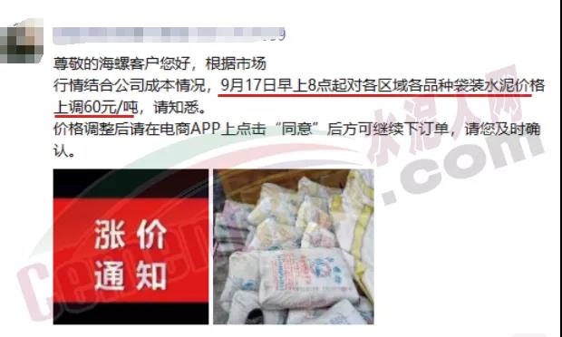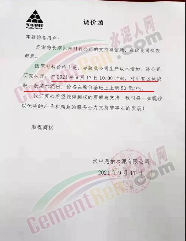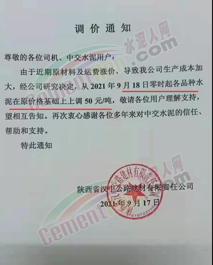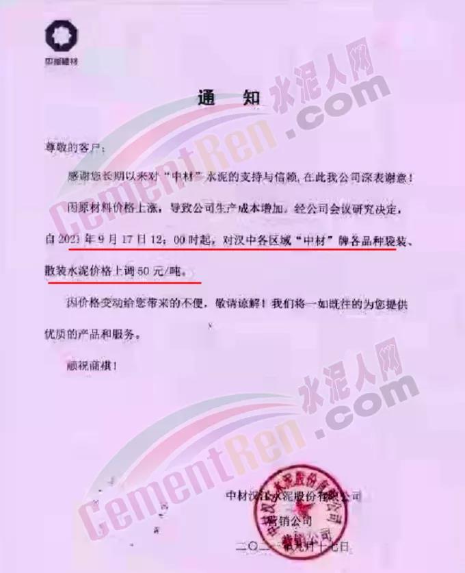 中材汉江水泥通知,自9月17日12时起对汉中各区域“中材”牌各品种水泥上调50元/吨。