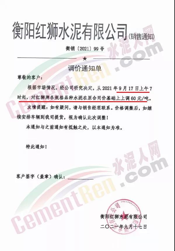 衡阳红狮水泥通知,自9月17日上午7时起上调各规格品种水泥价格60元/吨。