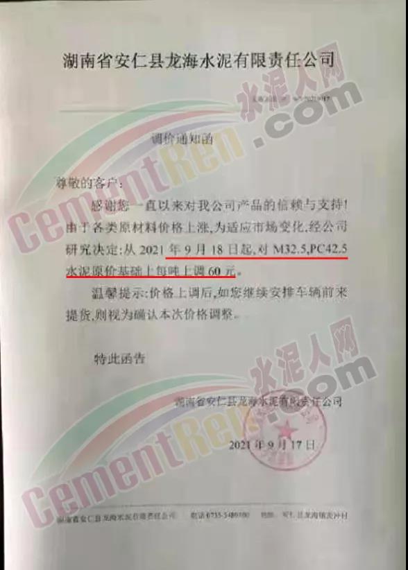 湖南省安仁县龙海水泥有限责任公司通知,自9月18日起,上调水泥价格60元/吨。