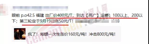 福建地区经销商通知称,目前P.O42.5散装水泥出厂价400元/吨,到达两广运费100-200元以下,并预告称第三轮涨价定于9月19日涨50元/吨。