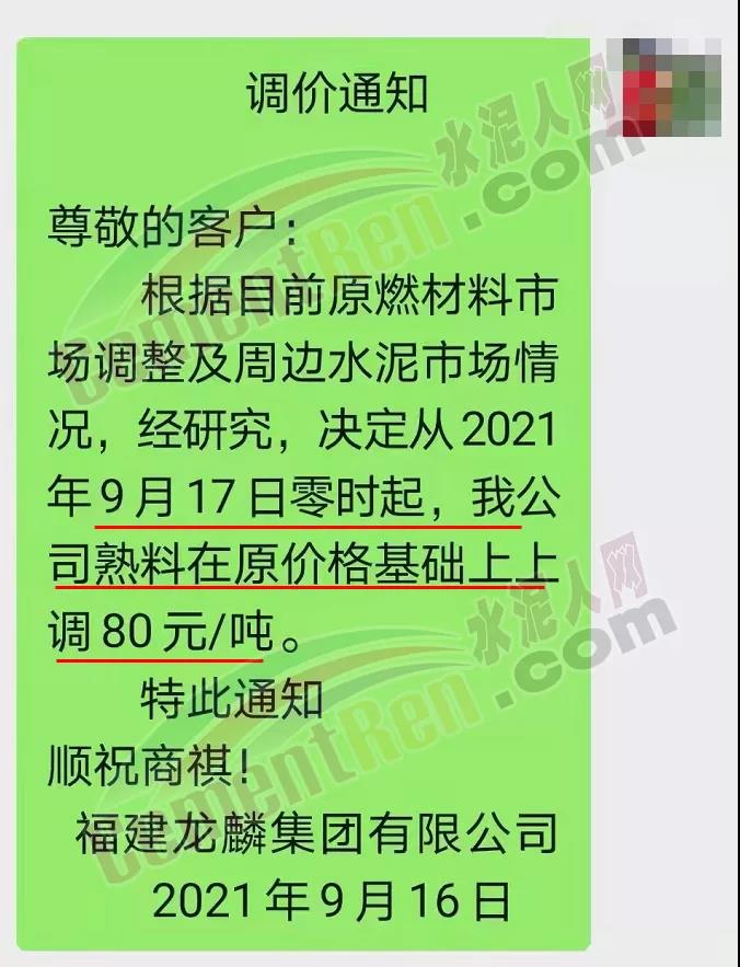 福建龙麟集团通知,9月17日零时起,公司熟料在原价基础上上调80元/吨。