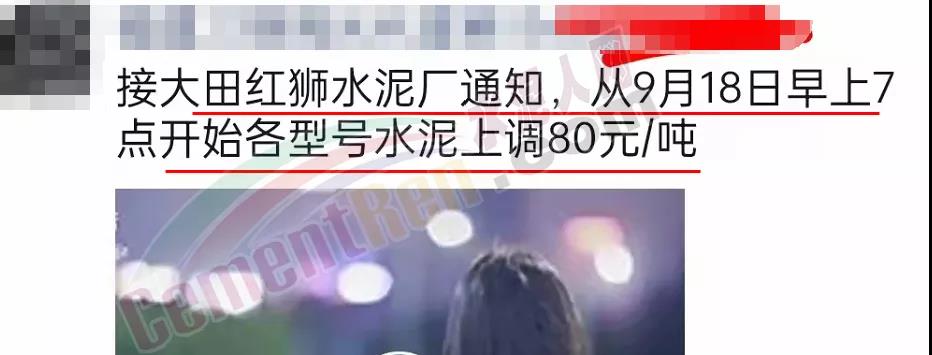 大田红狮水泥厂通知,从9月18日早上7时起上调各标号水泥价格80元/吨。
