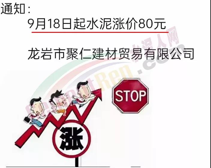 龙岩市聚仁建材贸易有限公司通知,9月18日起水泥涨价80元/吨。