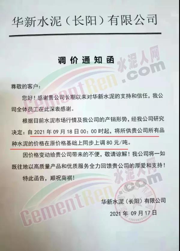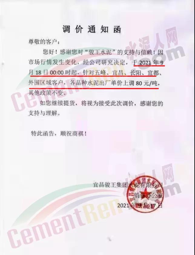 湖北宜昌骏王集团通知9月18日0时起,针对五峰、宜昌、长阳、宜都外围区域客户,各品种水泥出厂单位上调80元/吨。