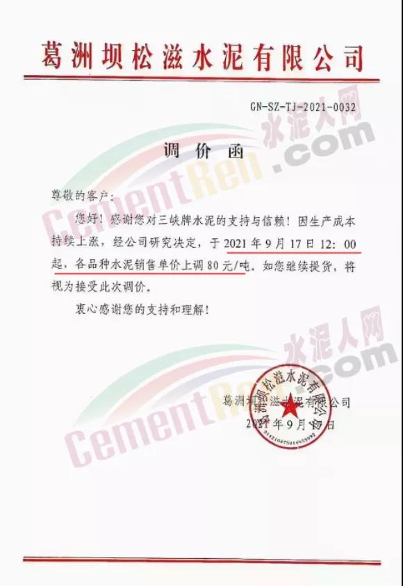 葛洲坝松滋水泥有限公司通知因生产成本持续上涨,于9月17日12时上调各标号水泥价格80元/吨。