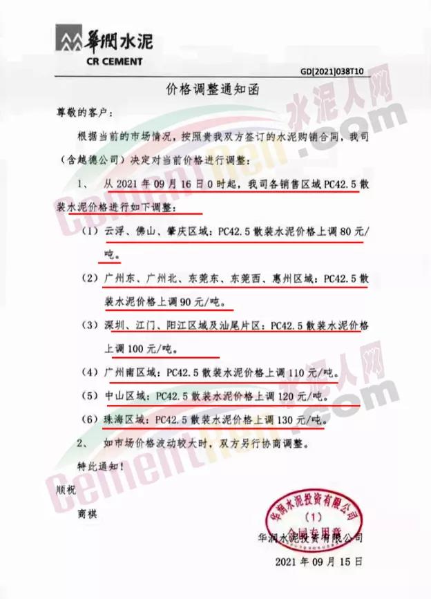 华润水泥通知根据当前的市场情况,公司(含越德公司)从2021年9月16日0时起,公司各销售区域PC42.5散装水泥价格进行调整: