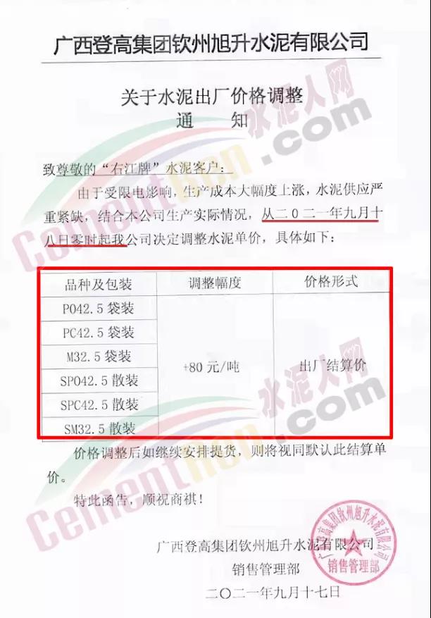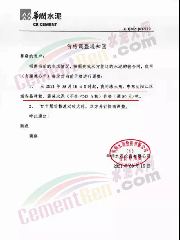 华润水泥通知,根据当前的市场情况,公司(含越德公司)从2021年9月16日0时起,珠三角、粤东及阳江区域各品种散、袋装水泥(不含PC42.5散)价格上调 80元/吨。