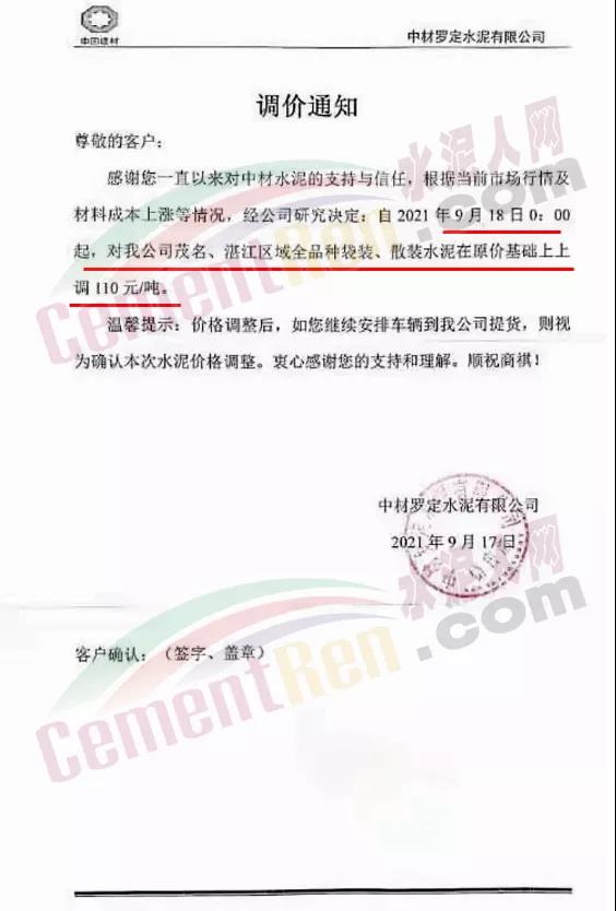 中材罗定水泥有限公司通知,自9月18日0时起,公司茂名、湛江区域全品种水泥上调110元/吨。