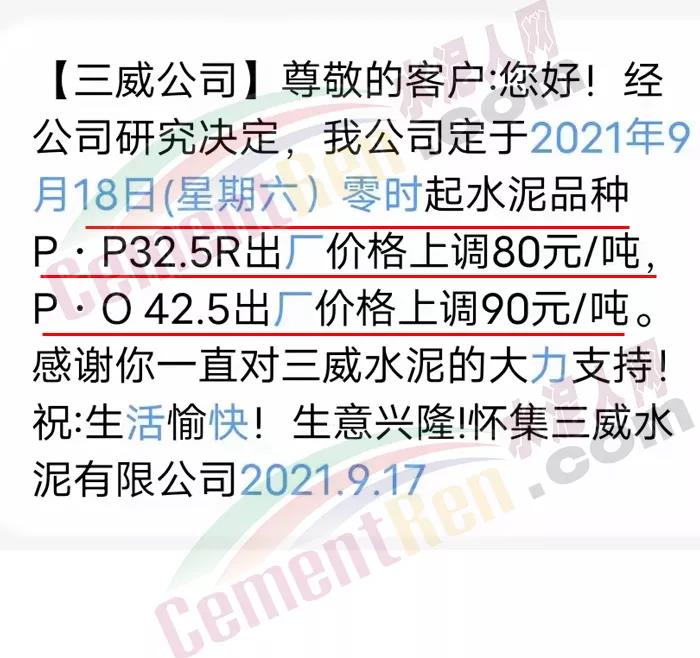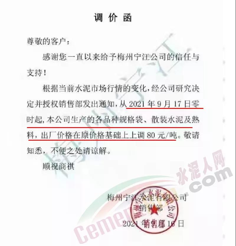 根据当前市场行情,我司决定自2021年9月18日零时起,上调三明区域各品种袋、散水泥价格80元/吨。特此通知!