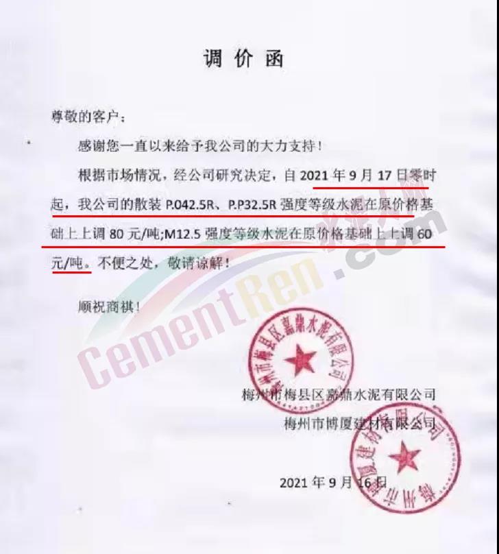 梅州市梅县区嘉鼎水泥通知,9月17日起上调各标号水泥80元/吨,M12.5上调60元/吨。