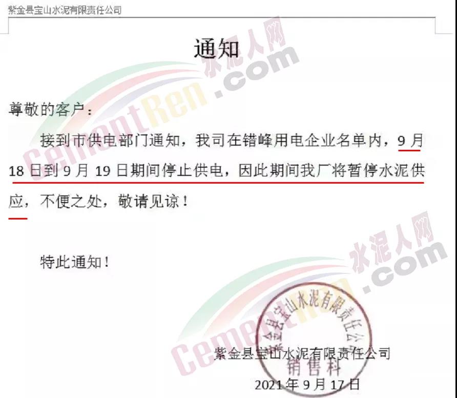 紫金县宝山水泥有限责任公司通知,9月18日到9月19日期间停止停电,因此期间工厂将暂停水泥供应。