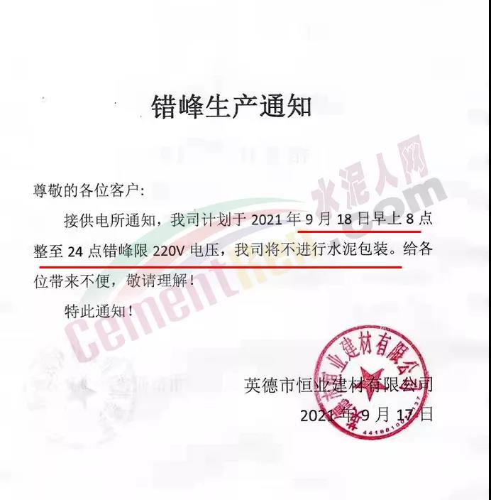 英德市恒业建材有限公司通知,9月18日早8点至24电错峰限220V电压,公司将不进行水泥包装。
