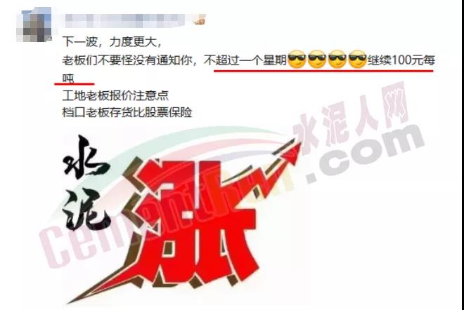 水泥销售提示说:下一波,力度更大,老板们不要怪没有通知你,不超过一个星期,继续涨100元/吨。工地老板报价注意点,档口老板存货比买股票保险。